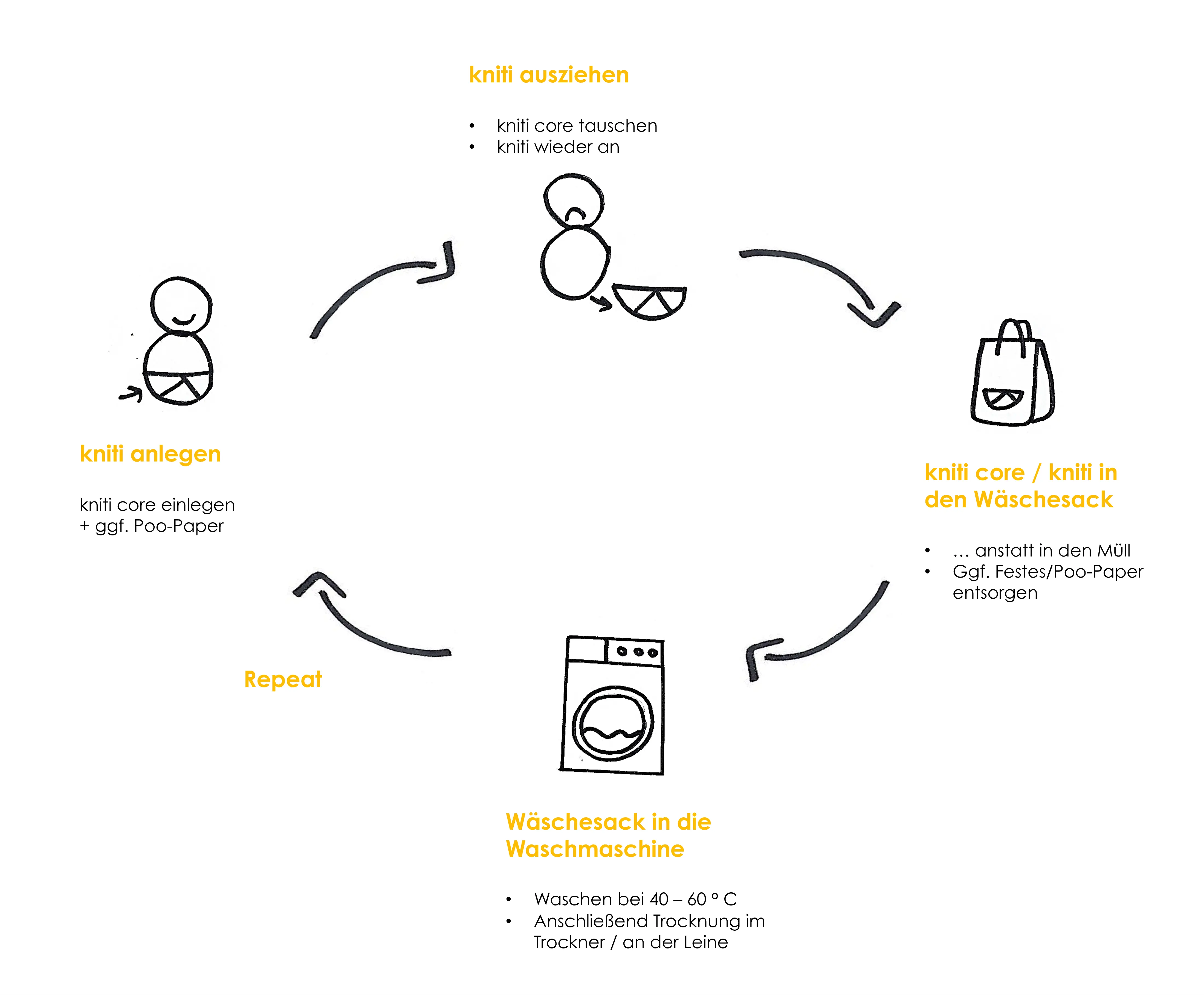 Die kniti ist wiederverwendbar. Zusammen mit mehreren kniti cores kann sie über längere Zeit genutzt werden und so viele Wegwerfwindeln ersetzen. Damit entsteht deutlich weniger Abfall im Alltag.