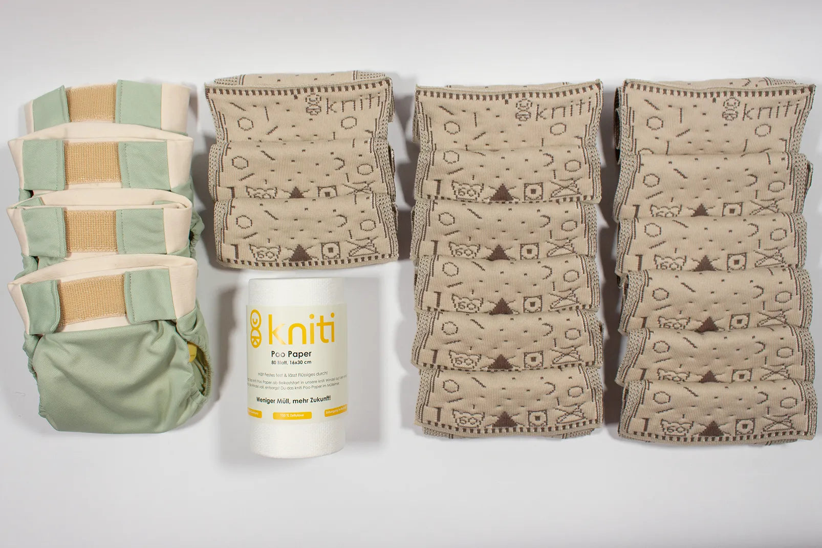 Die kniti kannst Du mit verschiedenen kniti cores mehrmals verwenden, bevor Du sie waschen musst. Im Schnitt benötigst Du 6-7 knitis plus 20 kniti cores je Größe, wenn Du immer mit unserer kniti wickeln möchtest. Wenn ihr regelmäßig abhaltet und Dein Kind sein großes Geschäft vorrangig ins Töpfchen macht reichen euch 3-4 knitis und 15 kniti cores.